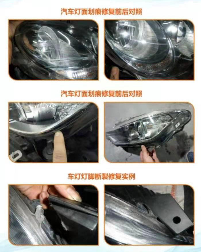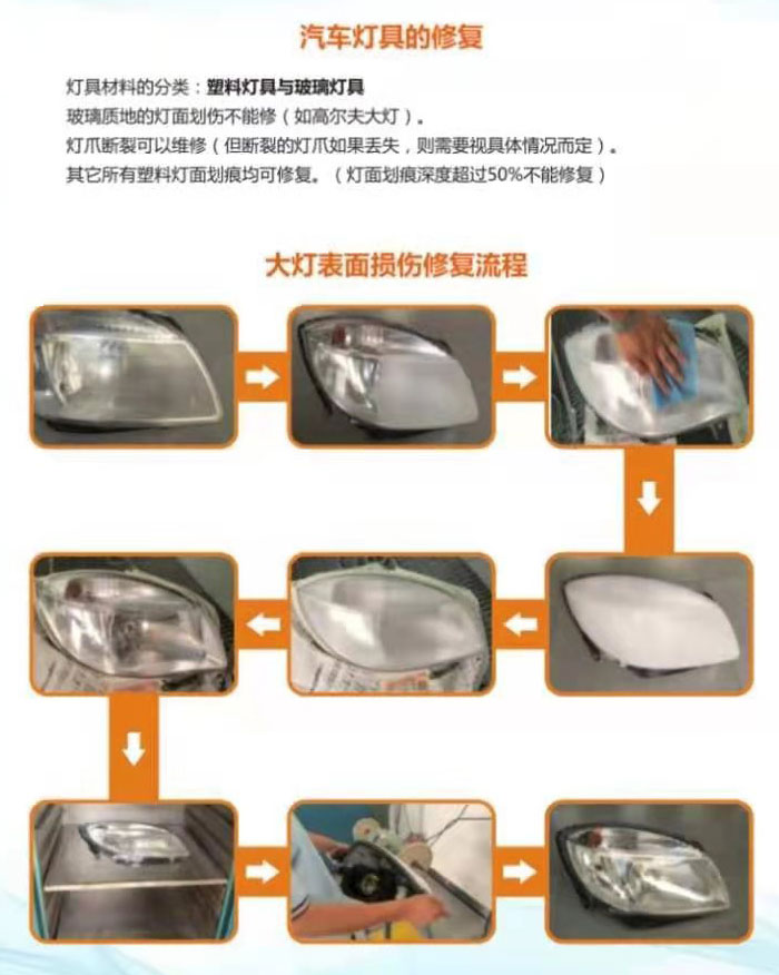 玻璃質地的燈面劃傷不能修(如高爾夫大燈),燈爪斷裂可以維修(但斷裂的燈爪如果丟失,則需要視具體情況而定),燈面明顯凹陷,大燈罩破裂,燈罩邊緣嚴重缺失,燈腳缺失不可修復,其它所有塑料燈面劃痕均可修復。修面:劃痕深度不超過燈面厚度1/2,可修復。修腳:燈腳斷裂。舊件在,可修復,同一大燈最多斷裂不能超過3個燈腳。備注:高額配件舊燈角缺失,可找舊燈角代替。